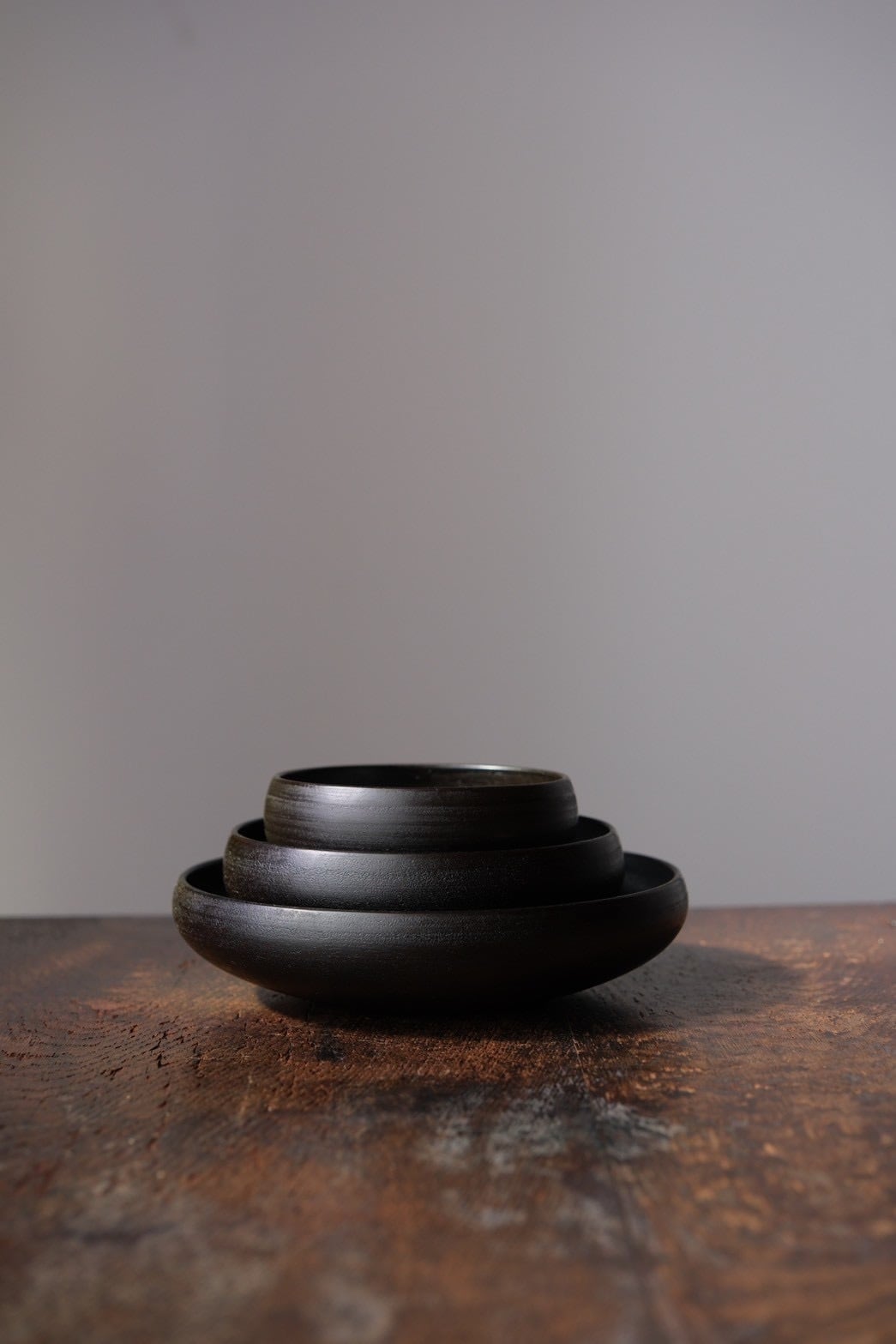 Displayed together in large, medium, and small sizes, the round bowls carry a dignified presence.