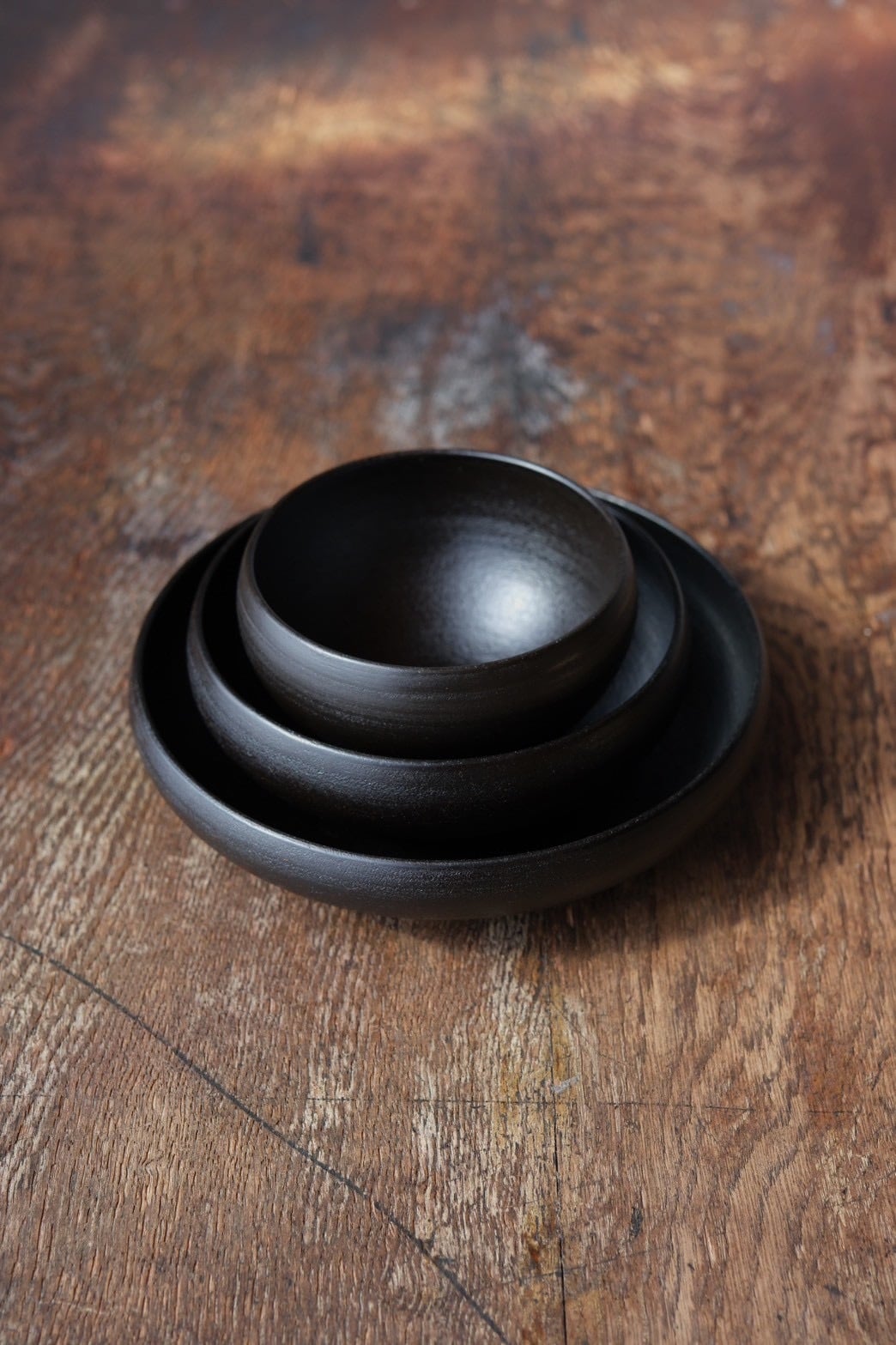 Displayed together in large, medium, and small sizes, the round bowls carry a dignified presence.