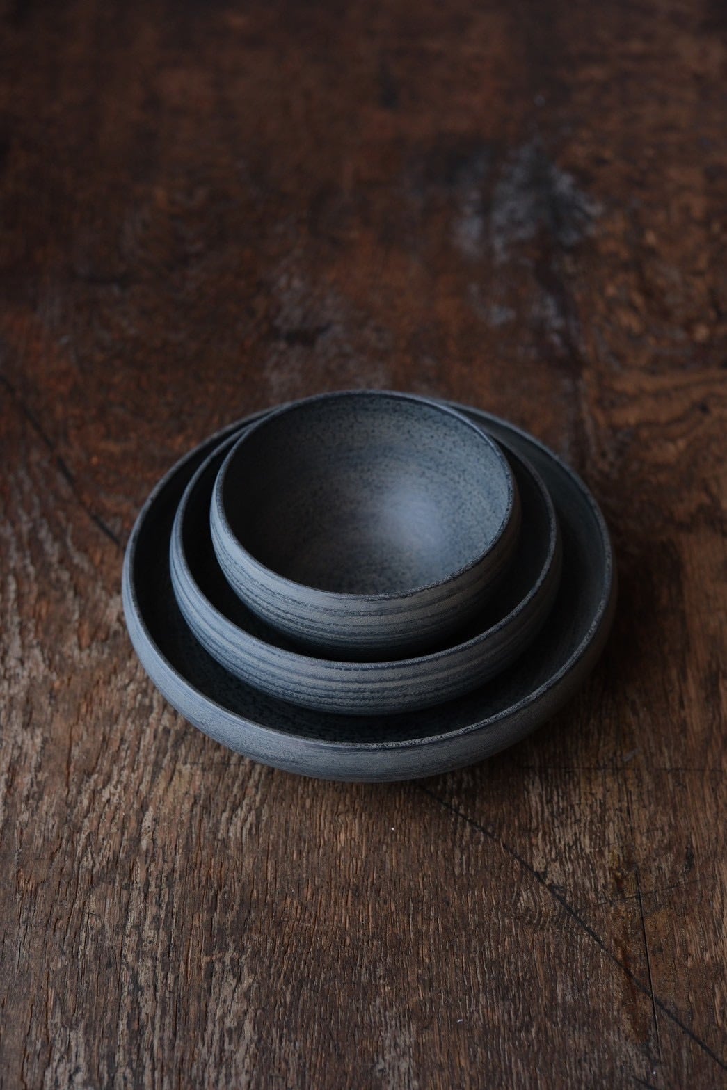 Displayed together in large, medium, and small sizes, the round bowls carry a dignified presence.