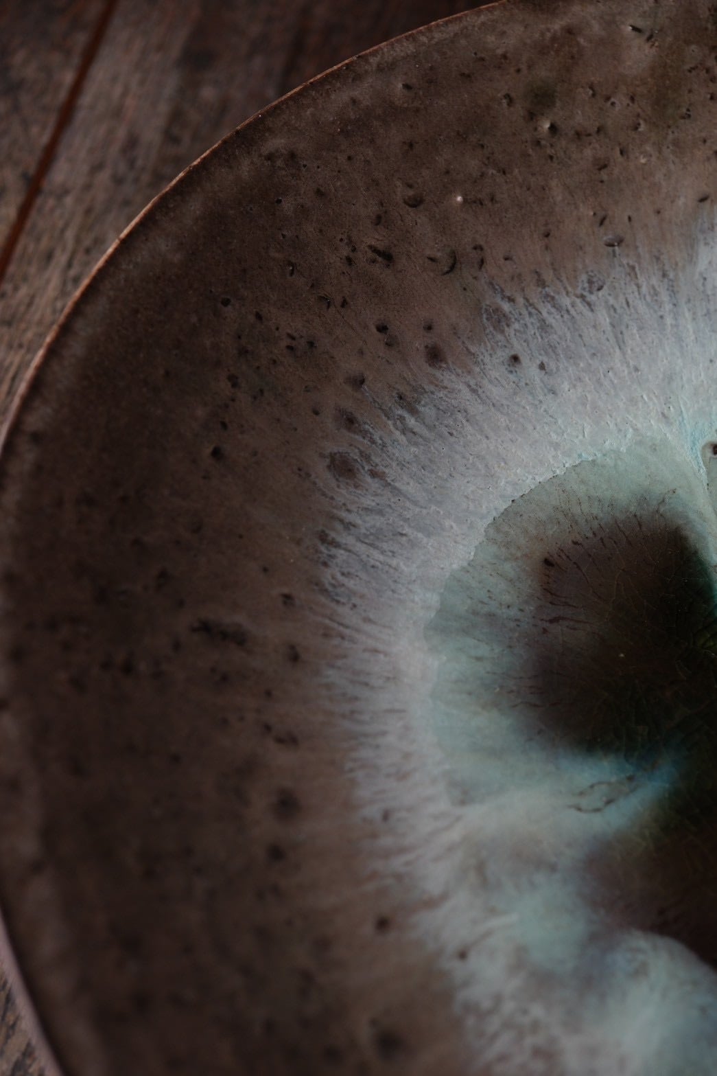 半月を描くような梅花皮と花びらが滲み、浮かぶような美しい釉薬に目が奪われる作品です