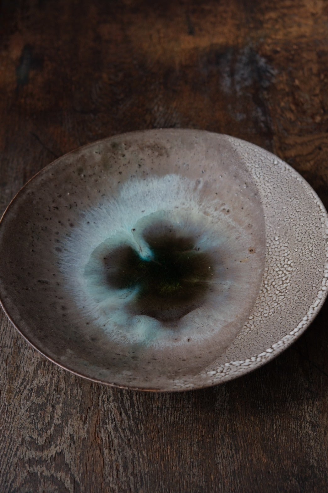 A captivating piece featuring kannyū crackle patterns that arc like a crescent moon, with petal-like forms softly bleeding and floating across the surface in a luminous glaze.